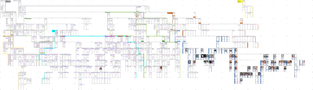 Remarques : Certains cousins patronymiques n’ont pas de photos car nous n’en n’avons pas; d’autres ne sont pas d’accord d’afficher leur image. Notre grand arbre, réalisé sur Excel, a été imprimé sur des feuilles A4, dont les unes à côté des autres forment un rectangle de 5m x 1m50.
